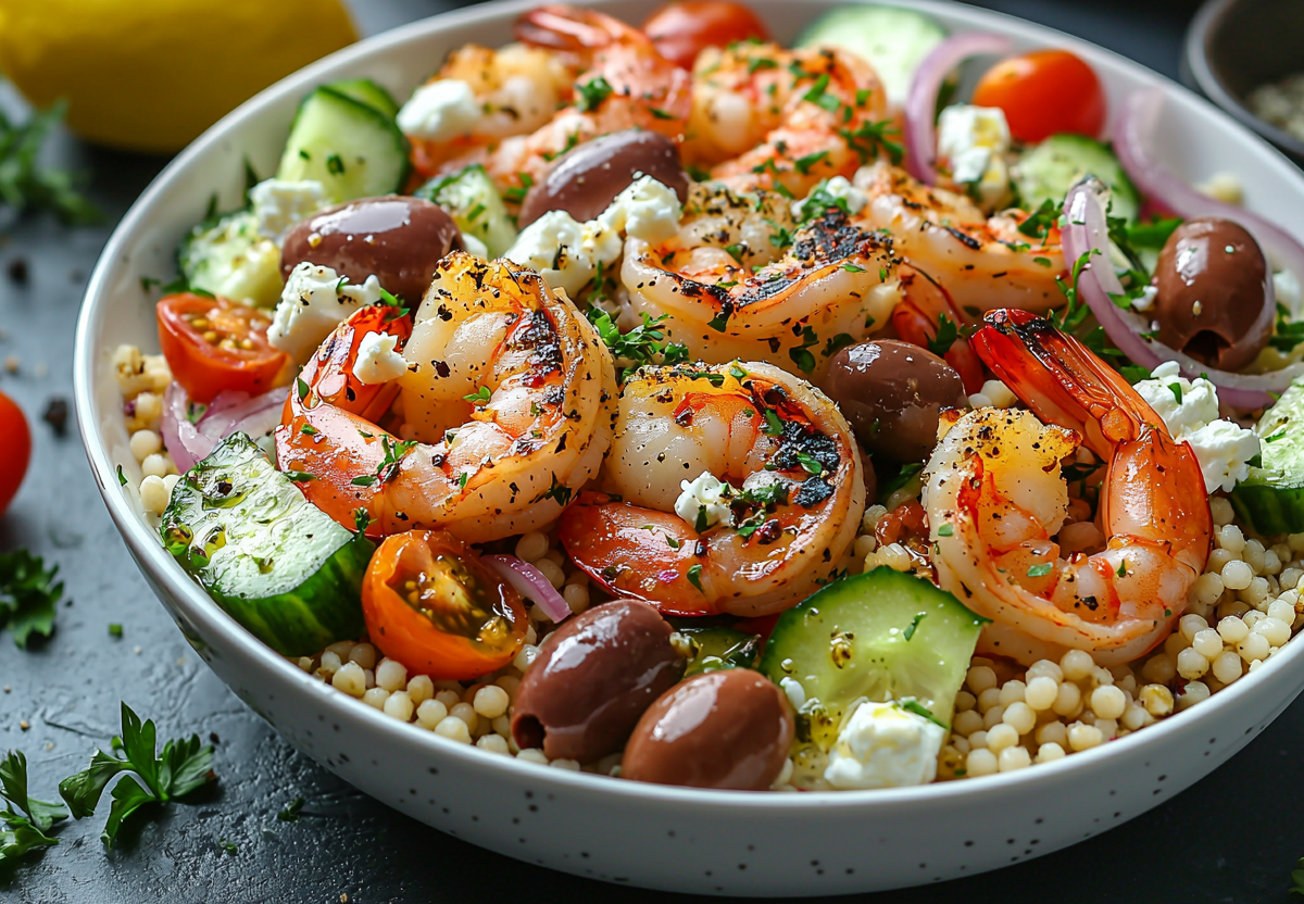 В большой миске соединяю остывший птитим и креветки, добавляю разрезанные пополам 10 помидоров черри, один огурец, нарезанный кубиками, половинку красной луковицы тонкими полукольцами и 10 оливок без косточек. Сверху аккуратно разламываю руками 100 г сыра феты. Отдельно встряхиваю в банке до однородности заправку из 2 ст. л. оливкового масла, сока половины лимона, соли и перца, заправляю салат прямо перед подачей и даю ему настояться 5–7 минут.