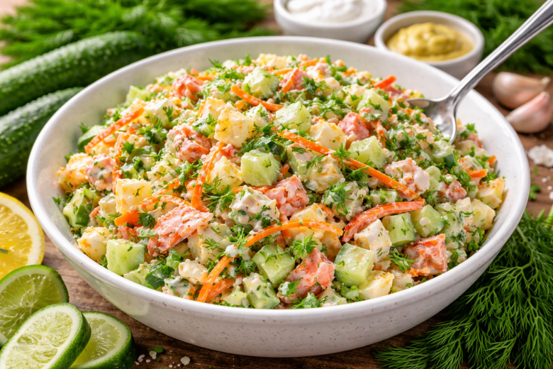 Получается освежающий и нежный салат: огурцы приятно хрустят, зелень дает аромат, а йогуртовая заправка с чесноком и горчицей добавляет легкую пикантность без тяжести майонеза.