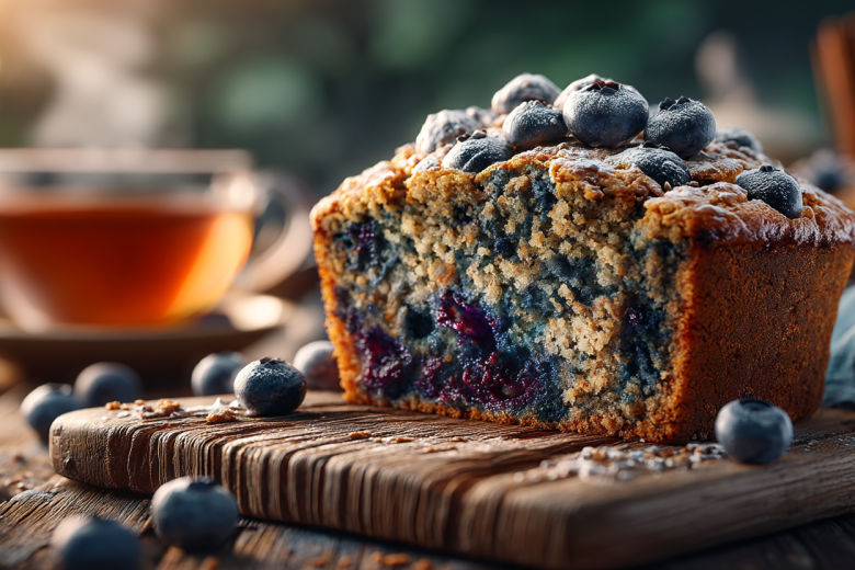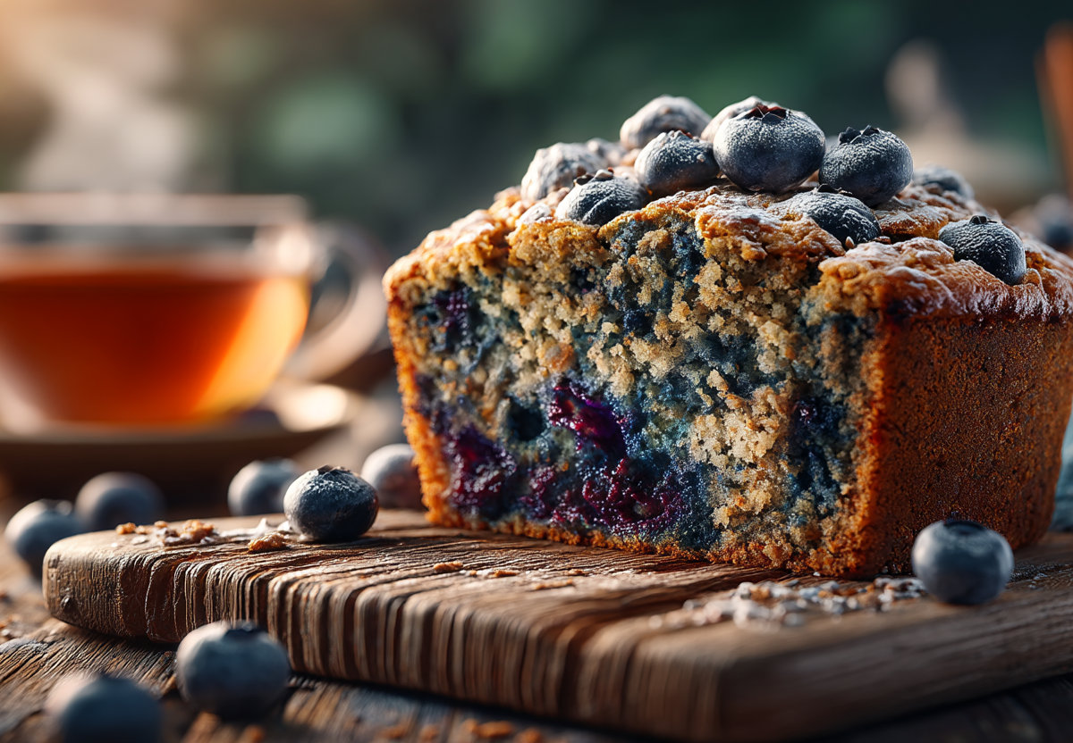 Цельнозерновая пшеничная мука (200 г), пшеничные отруби (30 г), разрыхлитель (10 г), коричневый сахар (100 г), ванильный сахар (10 г), какао-порошок (20 г), щепотка морской соли, растительное масло без запаха (80 мл), вода (150 мл), свежая или замороженная голубика (150 г), соевое молоко (30–50 мл, по необходимости).