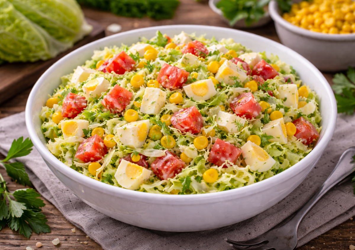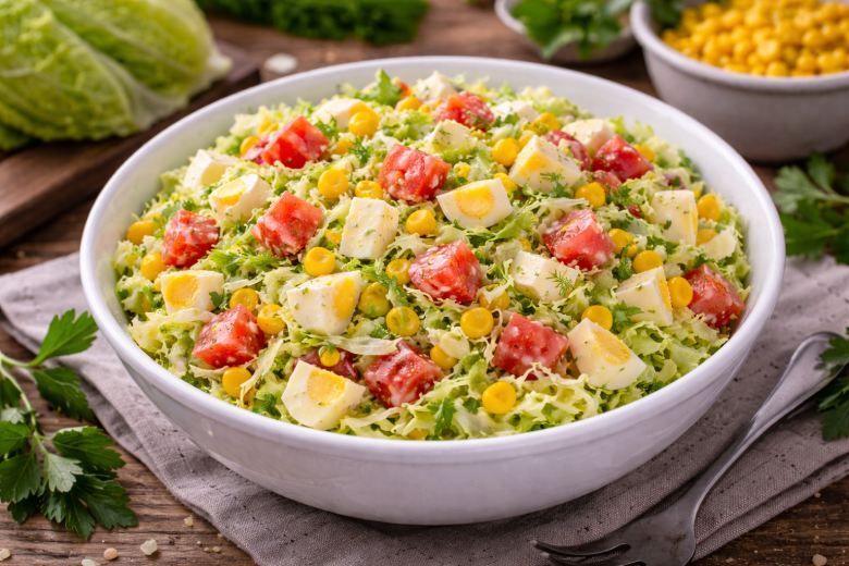 Пекинскую капусту нарезаю тонкими полосками, помидор и вареные яйца — аккуратными кусочками. Добавляю кукурузу и перемешиваю, чтобы салат получился равномерным и сочным.