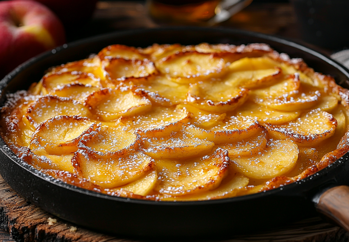 Этот жареный пирог готовится на раз-два, даже проще шарлотки! Кладу яблоки на сковороду и заливаю жидким тестом. Его верхушка покрывается аппетитной золотистой корочкой, а внутри он остается влажным и напоминает пудинг.