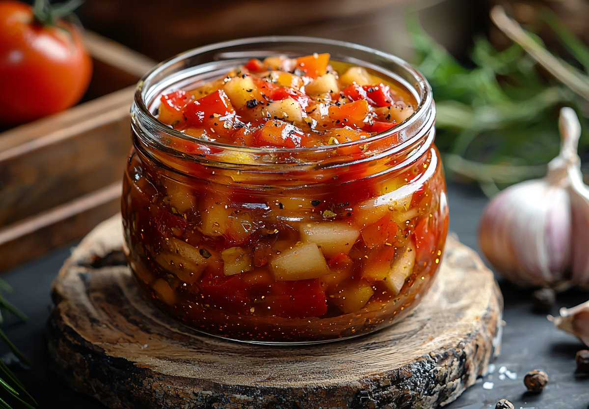 Это лечо станет главным хитом ваших зимних заготовок! Неожиданное сочетание сочных перцев, спелых томатов и кисло-сладких яблок создает неповторимый вкусовой букет — в меру пикантный, с легкой фруктовой ноткой. Идеальный аккомпанемент к мясу, кашам или просто на хрустящем хлебе.