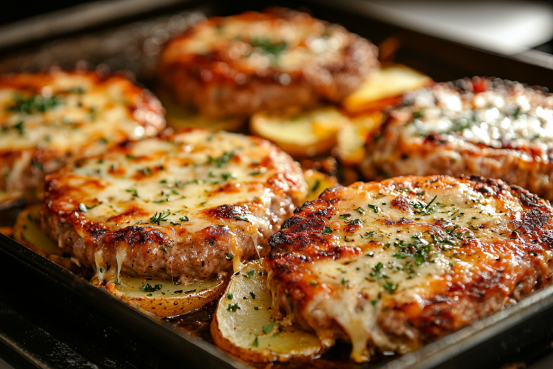 Для приготовления вам понадобится: 500 г смешанного фарша (свинина и говядина), 1 яйцо, 6 картофелин, нарезанных дольками, соль, специи; для заливки — 200 г сметаны, 1 яйцо, 2 средних помидора, соль, перец. Разогрейте духовку до 200 °C. Фарш смешайте с яйцом, солью, перцем, вымесите и сформируйте крупные, плоские котлеты. На каждой сделайте глубокое, широкое углубление пальцами. Помидоры нарежьте мелкими кубиками. Отдельно взбейте сметану с яйцом, солью, перцем, добавьте помидоры — это заливка. Картофельные дольки сбрызните маслом, посолите. На противень, застеленный пергаментом, выложите котлеты. В углубления каждой равномерно разлейте сметанную заливку с помидорами. Между котлетами разложите картофель. Запекайте 35–40 минут до готовности картофеля и румяной корочки на мясе.