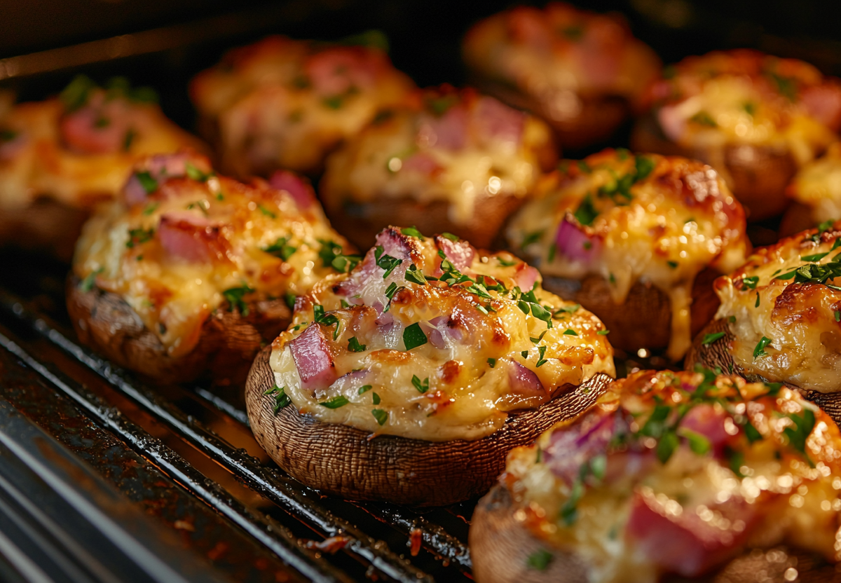Фаршированные запечённые шампиньоны с ветчиной и сыром. Ароматная и сытная закуска, которая украсит любой стол! Нежные грибы, пропитанные сметанно-чесночным маринадом, сочетаются с пикантной начинкой из ветчины и лука, а расплавленный сыр добавляет блюду аппетитную корочку.