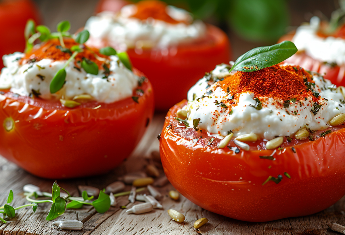 Эта закуска — настоящая находка для летнего стола. Сочные томаты в сочетании с чесночно-творожной начинкой не оставляют равнодушными, особенно в жару, когда не хочется тяжелой еды.