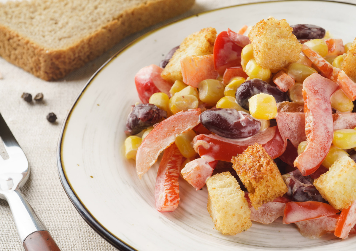 Хотите быстро и без усилий приготовить сытный, приятно хрустящий салат? Тогда закуска из фасоли, кукурузы и сухариков — для вас. Соединяем самые доступные ингредиенты и наслаждаемся!