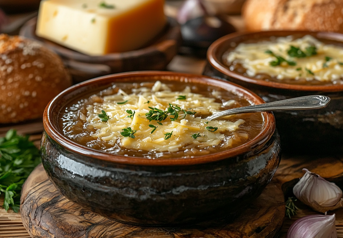 Нарежьте четыре крупные луковицы тонкими полукольцами. В толстостенной кастрюле растопите 50 граммов сливочного масла, добавьте лук и тушите на медленном огне около 20 минут, пока он не станет мягким и прозрачным, но не коричневым. Посолите и поперчите по вкусу. Главный секрет аромата — влить в лук столовую ложку яблочного уксуса и добавить столовую ложку сахара, хорошо перемешав. Это создаст нужную вкусовую гамму. Залейте овощ литром кипятка и варите суп под крышкой 15 минут. В это время нарежьте багет на кусочки и слегка подсушите в тостере или на сухой сковороде. Разлейте готовый суп по тарелкам, сверху положите два-три ломтика багета и обильно посыпьте тертым сыром. Поставьте тарелки под гриль на 2-3 минуты, пока сыр не расплавится и не покроется румяными пузырями. Подавайте немедленно.