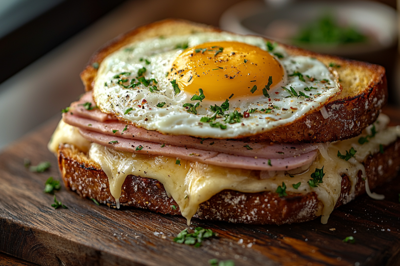 Вам понадобится: 4 ломтика багета толщиной 2 см, 4 ломтика ветчины, 4 тонких ломтика твердого сыра (например, гауда или эмменталь), 2 яйца, 100 мл молока, 2 ст. л. сливочного масла, соль, мускатный орех и зелень для подачи. Слегка взбейте молоко с щепоткой соли и мускатного ореха. Ломтики багета обмакните в молочную смесь с двух сторон, давая хлебу впитать жидкость, но не размокнуть. На два ломтика выложите ветчину и сыр, накройте оставшимися ломтиками, слегка прижмите. Обжарьте сэндвичи на сливочном масле с двух сторон до золотистой хрустящей корочки. Подавайте горячими, увенчав каждый яйцом пашот и посыпав свежей зеленью.