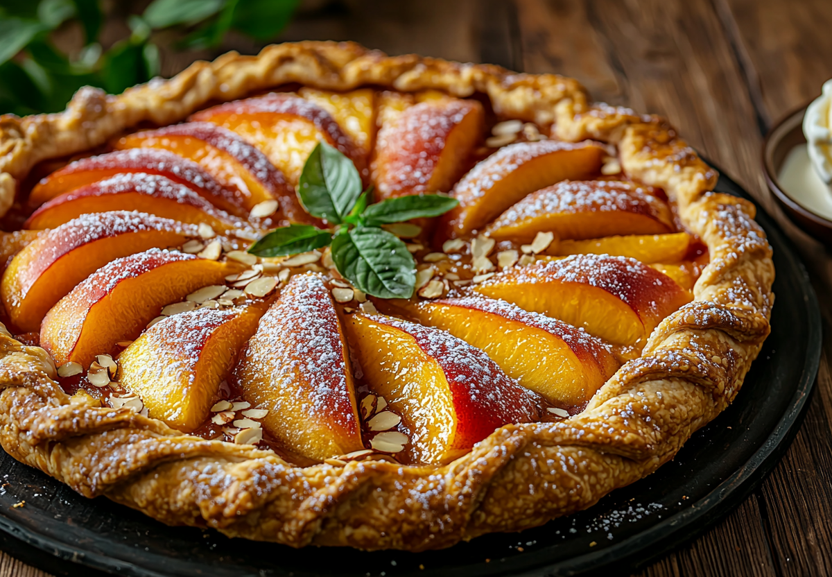 - Персики нарежьте, смешайте с крахмалом и сахаром. Раскатайте тесто в круг, выложите начинку в центр, заверните края. Смажьте края желтком, посыпьте миндалем. Выпекайте 35–40 минут при 180 °C. Подавайте с ванильным мороженым.