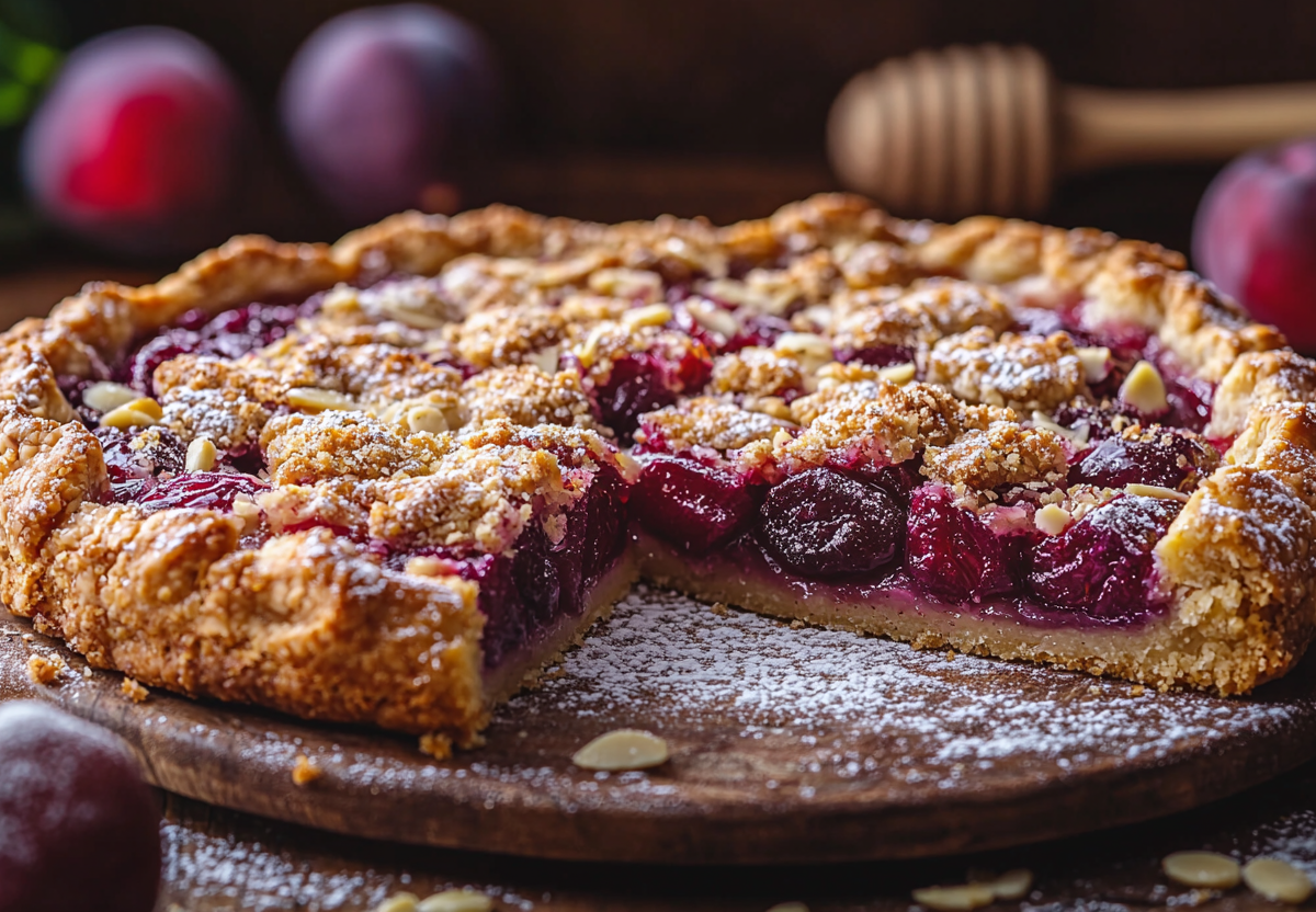 Галета со сливами и крошкой! Десерт для выходных круче, чем в кондитерской! Ароматное медовое тесто с нотками кардамона, сочная начинка из спелых слив и хрустящая крошка штрейзеля создают потрясающую гармонию вкуса. Это та выпечка, перед которой невозможно устоять.