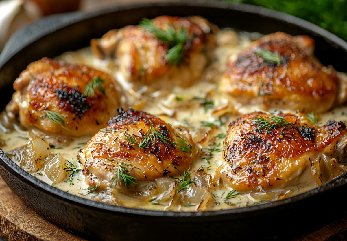 Для приготовления понадобится: 6–8 куриных голеней или бедер, 2 луковицы, 300 мл сметаны (15–20%), 2 ст. л. муки, соль, перец, лавровый лист, зелень, растительное масло для жарки.