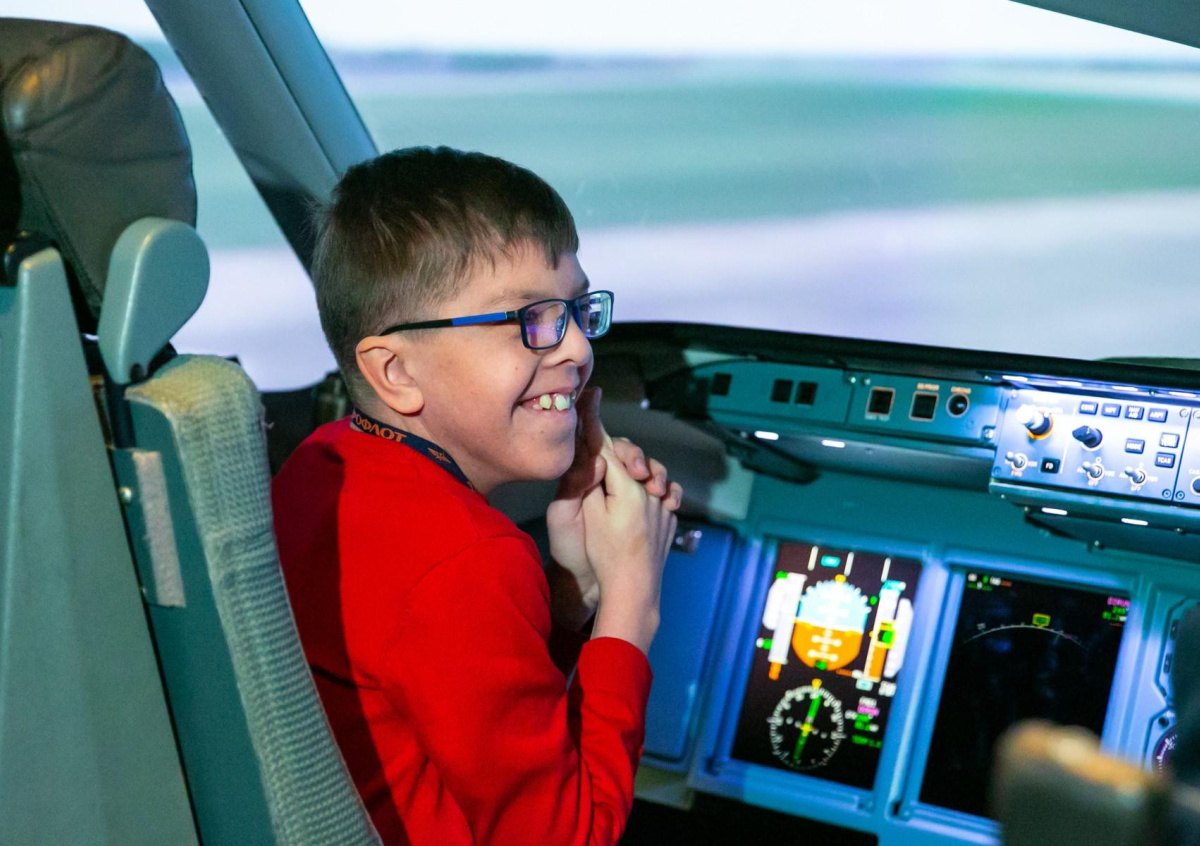 Вместе с главой ведомства мальчик совершил имитационный полёт на полнопилотажном тренажёре воздушного судна Sukhoi Superjet 100.