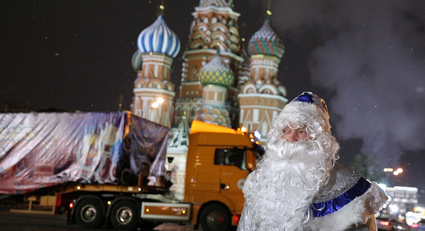 Дед Мороз за рулём автопоезда доставил в Московский Кремль главную новогоднюю ель страны. Она будет установлена на Соборной площади.