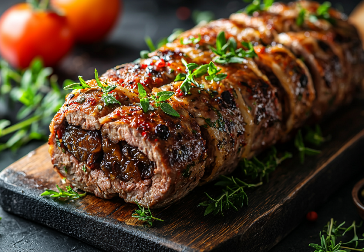 Горячее на Новый год: говяжий рулет с сыром под вишневым джемом и барбекю. Готовится просто, но все попадают в обморок от шедеврального вкуса. Этот рулет — эффектное блюдо для праздника. Нежная говядина, сладковатый чернослив, хруст орехов и тягучий сыр создают плотную, насыщенную начинку. А блестящая глазурь из вишневого джема и барбекю-соуса делает вкус глубже и ярче, создавая идеальный баланс сладости, кислинки и дымных нот.