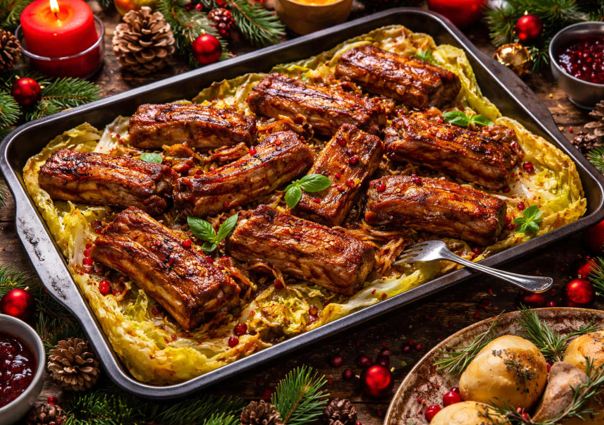 Готовим вкусные ребрышки на капустной подушке. Стоит лишь выложить мясо на противень, застеленный капустными листьями, и отправить в духовку, как кухня наполняется праздничным ароматом. Ребрышки получаются сочными, мягкими и насыщенными по вкусу. Такое горячее идеально подойдет для рождественского стола и уютного семейного ужина.