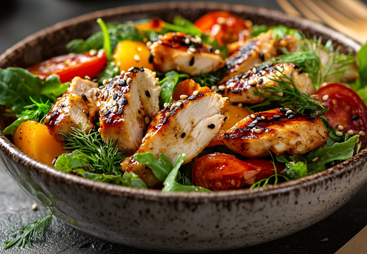 Тёплый салат с курицей — летнее настроение на тарелке! Этот салат — идеальный баланс сытности и свежести: нежное мясо, сочные овощи и пикантная заправка. То, что нужно для лёгкого ужина или обеда с настроением!