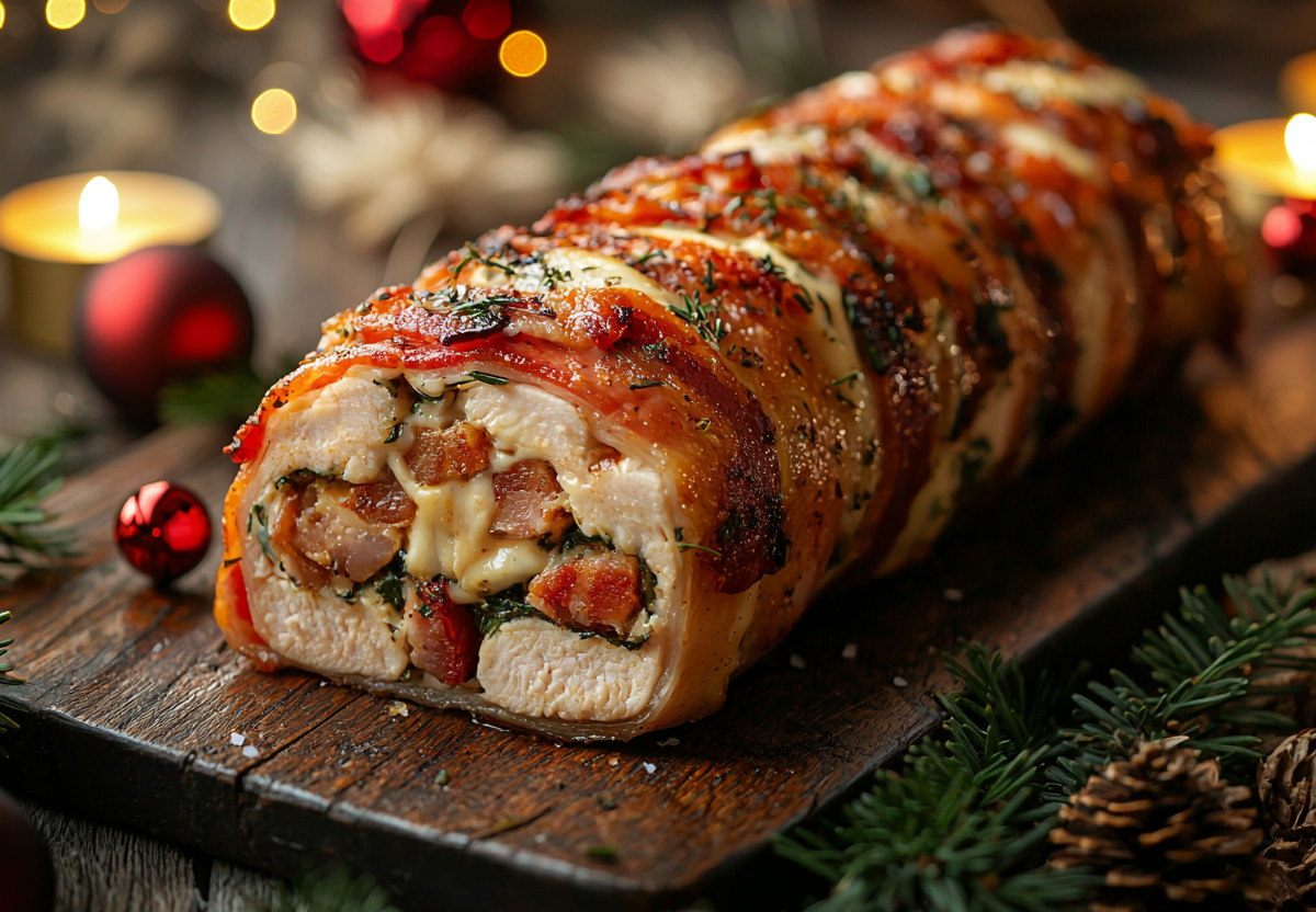 Рулет перенесите на противень, запекайте при 190 °C около 30–35 минут до румяной корочки, а затем дайте ему немного остыть, чтобы соки стабилизировались. Получается невероятно сочное мясо, хрустящая беконная корочка и тянущийся сыр внутри — простой, быстрый и роскошный новогодний рулет, который точно произведет впечатление.