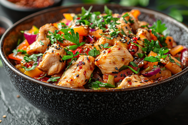 Куриную грудку отвариваю и разбираю на волокна. Лук и перец нарезаю тонкой соломкой. Смешиваю все ингредиенты в глубокой миске, добавляю специи, соевый соус и масло. Тщательно перемешиваю и оставляю настояться 1–2 часа в холодильнике. Перед подачей посыпаю свежей зеленью.