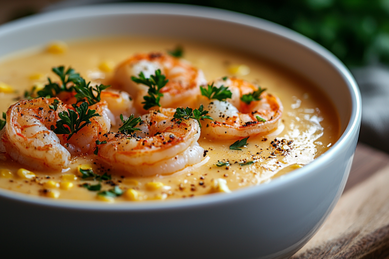 Этот суп я впервые попробовал в портовом ресторанчике в Лионе — шеф-повар назвал его «бархатным золотом» за нежнейшую текстуру и солнечный цвет. Меня покорило сочетание сладковатой кукурузы и нежных креветок в этом изысканном крем-супе. С тех пор это мое любимое блюдо для особых обедов.