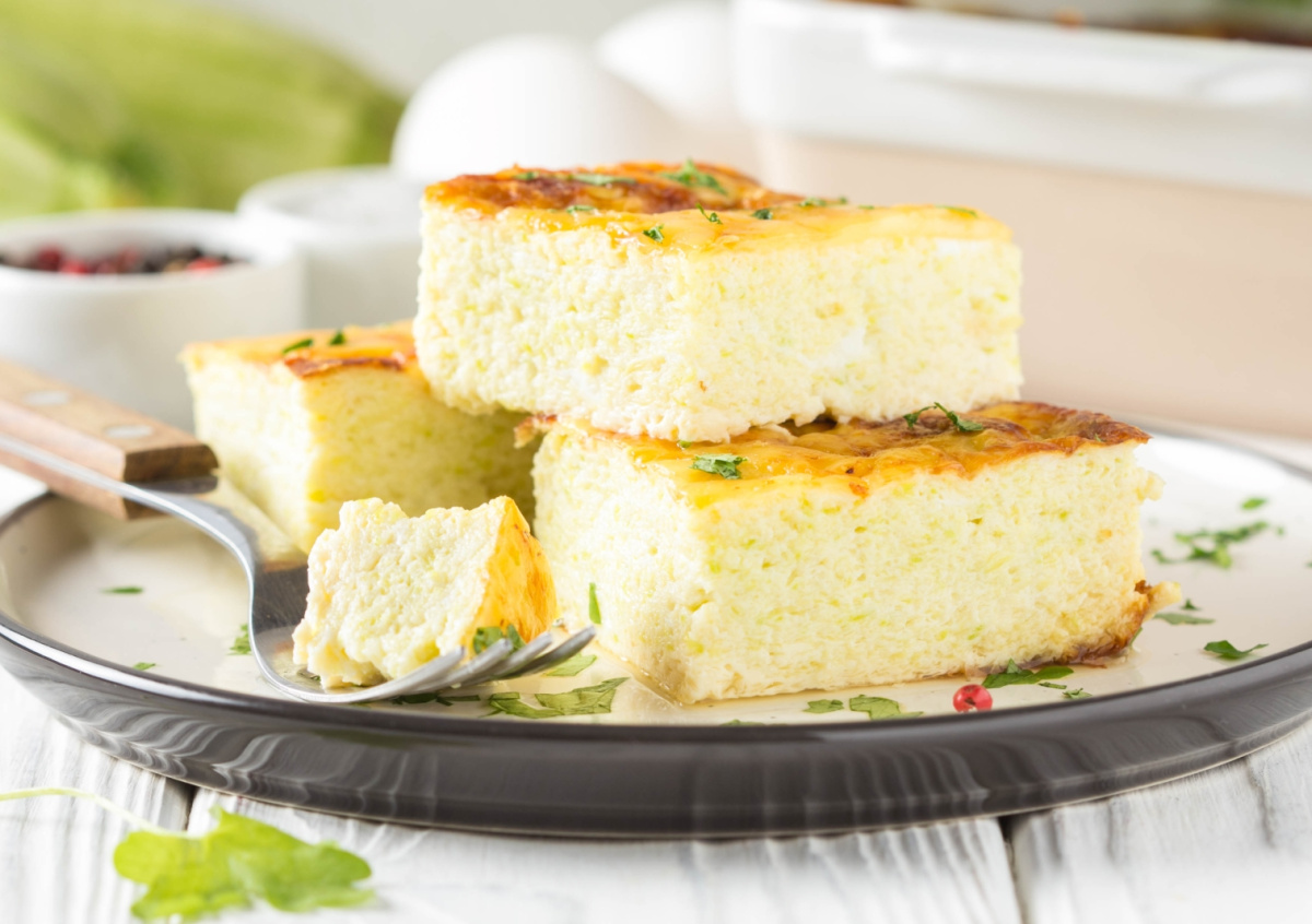 Достаньте готовый омлет из духовки, слегка остудите и нарежьте на порции. Подавайте теплым.