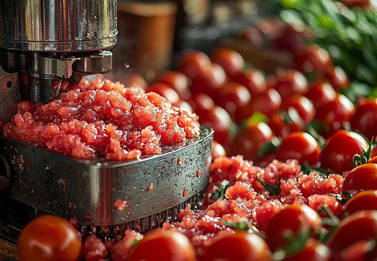 Пропустите нарезанные помидоры через мясорубку. Это позволит извлечь сок и мякоть.