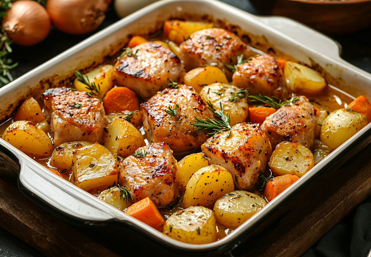 Нарежьте 500 г свиной шеи кубиками, 6 картофелин — крупными дольками. Выложите в смазанную маслом форму слоями, пересыпая солью, перцем, 1 ч. л. паприки и 3 измельченными зубчиками чеснока. Добавьте 1 нарезанную морковь и 1 луковицу кольцами. Залейте 200 мл воды или бульона, накройте фольгой и запекайте 1 час при 180 °C, за 10 минут снимите фольгу для румяной корочки.