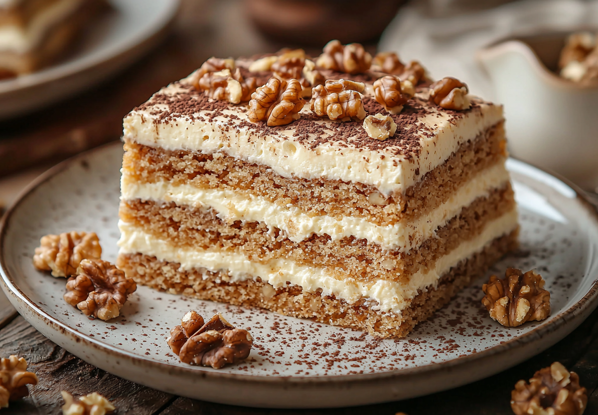 Грецкие орехи (100 г) слегка обжариваю на сухой сковороде, остужаю и крупно рублю. Мягкое сливочное масло (180 г) взбиваю миксером 3-4 минуты до белого пушистого состояния. Не прекращая взбивать, постепенно добавляю всю банку вареной сгущенки. Взбиваю еще 5–7 минут до однородного гладкого крема. Холодные сливки 33% (200 мл) взбиваю в отдельной чаше до устойчивых пиков. Аккуратно лопаткой вмешиваю взбитые сливки в масляно-сгусточный крем. Собираю торт: на блюдо кладу вафельный корж. Наношу тонкий слой крема (около 0,5 см), разравниваю и посыпаю частью орехов. Накрываю следующим коржом. Повторяю слои, пока не закончатся коржи. Верхний корж и бока обильно смазываю оставшимся кремом. Украшаю торчащими орехами. Накрываю торт пищевой пленкой и убираю в холодильник минимум на 4 часа, а лучше на ночь.