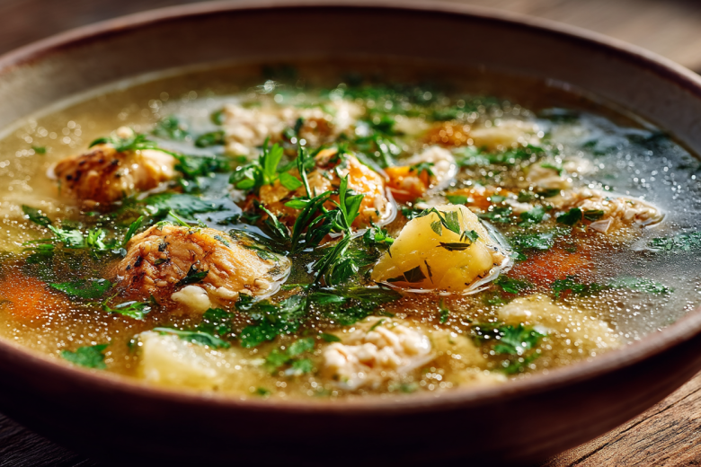 Этот суп — мастерское сочетание диетической куриной основы и нежных овсяных хлопьев, которые создают бархатистую текстуру и делают блюдо невероятно легким для пищеварения. А финальный аккорд из растертой с солью петрушки и чеснока раскрывает букет ароматов, превращая простой рецепт в гастрономический комплимент себе и близким.