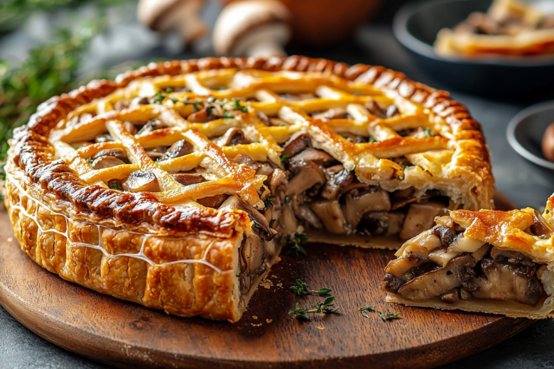 Рецепт: обжарьте 300 г куриного филе и 400 г шампиньонов, добавьте 2 обжаренные луковицы. Залейте 200 мл сливок 20%, потушите 10 минут, добавьте соль, перец. Раскатайте 500 г слоеного теста, выложите в форму, сделав высокие бортики. Наполните начинкой, сверху покройте сеткой из полосок теста или полностью закройте вторым пластом, сделав отверстия для выхода пара. Смажьте желтком, выпекайте 35–40 минут при 180 °C. За 10 минут до готовности можно посыпать 100 г тертого сыра.