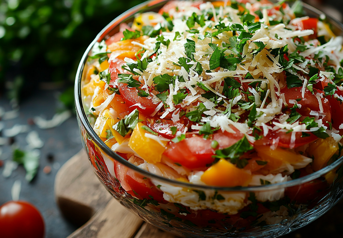 Этот салат — настоящее спасение, когда нужно быстро приготовить что-то нарядное и вкусное. Яркие слои и контраст текстур создают эффект сложного блюда, хотя готовится оно за 15 минут.