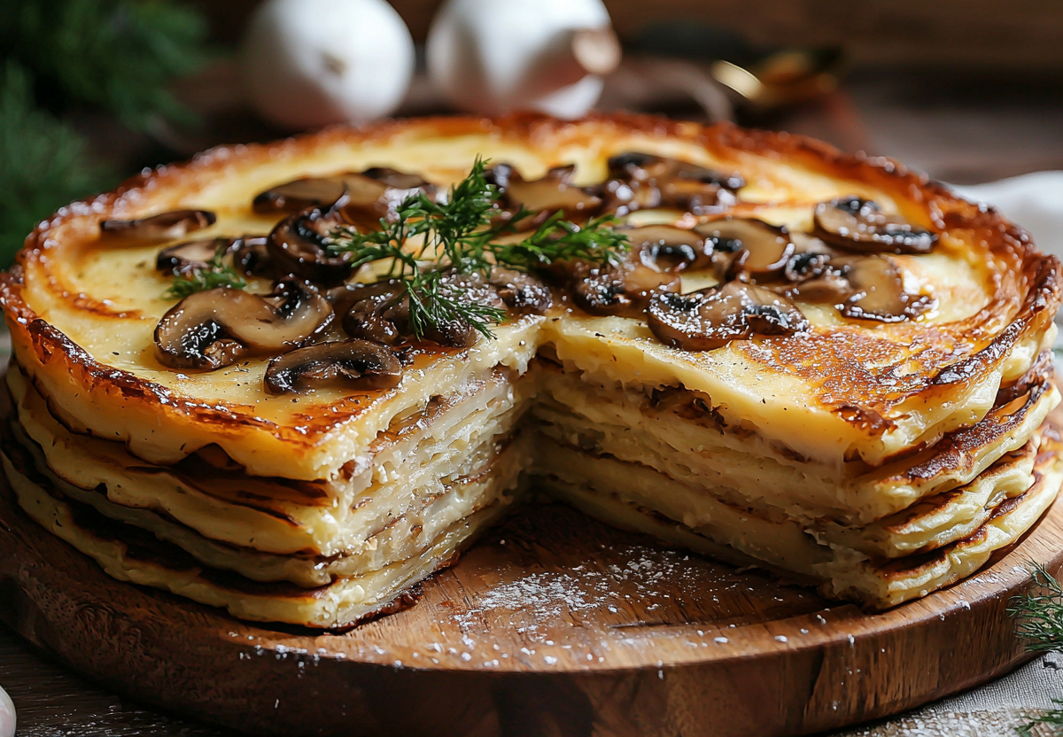 Праздничный стол требует особенных, запоминающихся блюд, которые удивят гостей не только вкусом, но и формой. Блинный пирог с шампиньонами — это блестящее решение, где простота встречается с изысканностью. Он объединяет в себе нежность тонких блинов, сочную ароматную начинку из обжаренных грибов с луком и золотистую сырную корочку. Это блюдо выглядит как настоящее кулинарное произведение, поражая своей слоеной структурой и насыщенным вкусом, при этом его приготовление — увлекательный и достаточно простой процесс, доступный даже тем, кто нечасто печет блины.