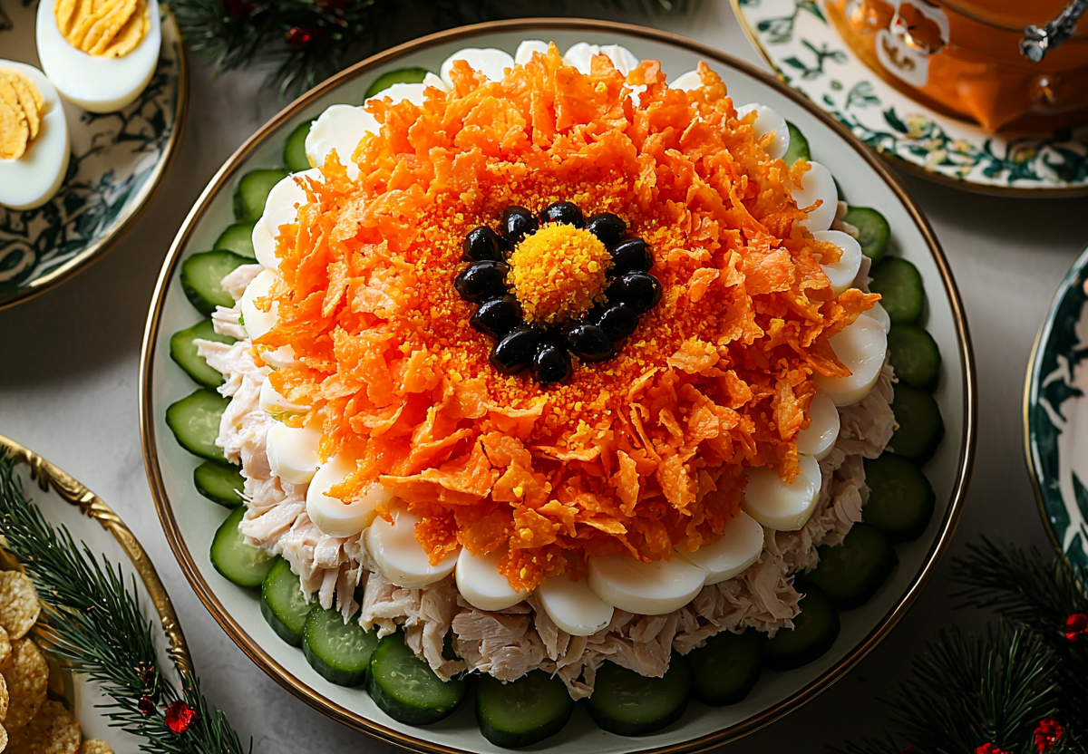 Готовлю салат «Подсолнух»: слоеная вкуснота вместо скучного оливье на праздник — яркое и сытное украшение стола