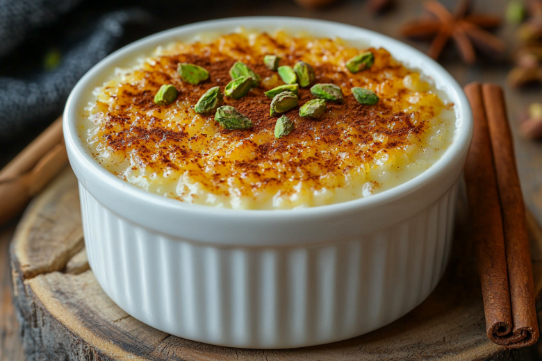 Для десерта тщательно промываю 4–5 столовых ложек круглого риса. Заливаю его в кастрюле двумя стаканами воды и варю на среднем огне до полного выкипания воды. Затем вливаю к рису 800 мл молока, довожу до кипения и варю на медленном огне, пока рис полностью не разварится, около 20–25 минут. В отдельной миске смешиваю 3 столовые ложки кукурузного или картофельного крахмала с 200 мл холодного молока и щепоткой ванильного сахара до однородности. Вливаю эту смесь тонкой струйкой в кастрюлю с рисом, постоянно помешивая. Добавляю 150 граммов сахара. Продолжаю варить на среднем огне, непрерывно помешивая, пока масса не загустеет до консистенции очень густой сметаны. Разливаю горячий пудинг по порционным керамическим формочкам или одной большой форме. Ставлю формочки в глубокий противень и аккуратно наливаю в противень горячей воды так, чтобы она доходила примерно до половины высоты форм. Отправляю в разогретую до 200 °C духовку на 20–25 минут, пока на поверхности не образуется характерная золотисто-коричневая корочка. Достаю, даю полностью остыть при комнатной температуре, затем убираю в холодильник на несколько часов. Подаю холодным, можно украсить молотыми фисташками, корицей или лепестками роз.