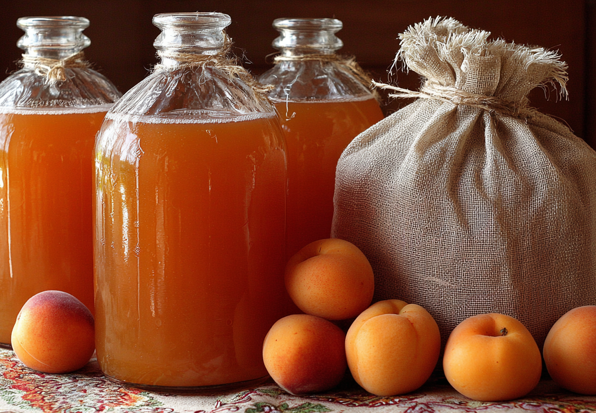 Возьмите 3 кг спелых абрикосов, удалите косточки и слегка разомните мякоть. Переложите фруктовую массу в эмалированную или стеклянную емкость. Влейте 2 литра воды, добавьте 300 г сахара и хорошо перемешайте. Накройте марлей и оставьте в теплом месте на 2–3 дня, чтобы смесь начала бродить.