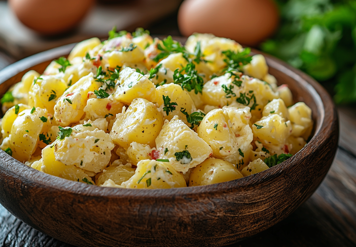 Рецепт: картофель отварите в подсоленной воде. Слейте отвар, сохранив 2 столовые ложки. Картофель немного остудите и нарежьте кружочками. В отдельной миске приготовьте заправку: смешайте теплый картофельный отвар, растительное масло, яблочный уксус, горчицу, выдавленный чеснок, мелко рубленную зелень, соль и перец. Взбейте венчиком до однородности. Залейте полученным соусом теплый картофель и аккуратно перемешайте. Дайте салату настояться при комнатной температуре около 30 минут, чтобы картофель впитал ароматы. Подавайте теплым или холодным, посыпав свежей зеленью.