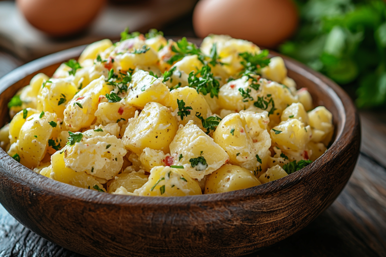 Для приготовления понадобится: 800 г картофеля, 4 ст. л. растительного масла, 2 ст. л. яблочного уксуса, 2 ст. л. картофельного отвара, 1 ч. л. дижонской или обычной горчицы, 2 зубчика чеснока, пучок свежей зелени (укроп, петрушка, зеленый лук), соль, перец.