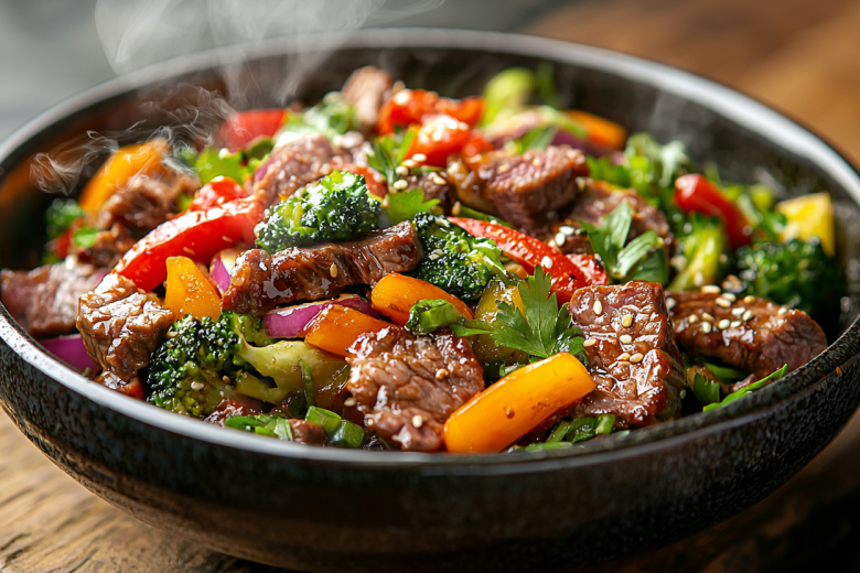 В этом салате нет ничего лишнего, только контраст. Теплая, сочная, обжаренная говядина. Хрустящие, свежие овощи, нарезанные тонкой соломкой. Ароматный, обожженный горячим маслом чеснок. И все это связано легким соевым соусом. Каждый компонент остается самим собой, но вместе они создают идеальную композицию.