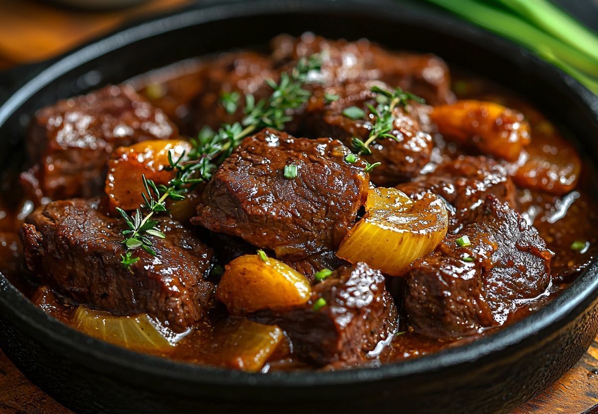 В глубокой сковороде разогреваю смесь масел и обжариваю говядину до румяной корочки. Добавляю лук и тимьян, готовлю еще 5 минут. Добавляю соевый и вустерский соусы, измельченный чеснок. Тушу под крышкой на медленном огне около 1,5 часа до мягкости мяса. Подаю, посыпав зеленым луком, с картофельным пюре или овощами.