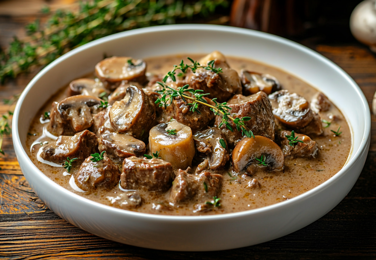Для приготовления нарежьте 600 г постной говядины брусочками. Обжарьте на сковороде 2 нарезанных луковицы и 300 г шампиньонов в течение 7 минут. Добавьте мясо и готовьте еще 10 минут. Положите 1 ст. л. горчицы, 1 ст. л. томатной пасты и листики 2 веточек тимьяна. Влейте 100 мл воды и тушите под крышкой около 30 минут до мягкости мяса. Затем добавьте 2 ст. л. йогурта и 200 мл обезжиренного молока, доведите до кипения, приправьте по вкусу и тушите еще 5 минут.
