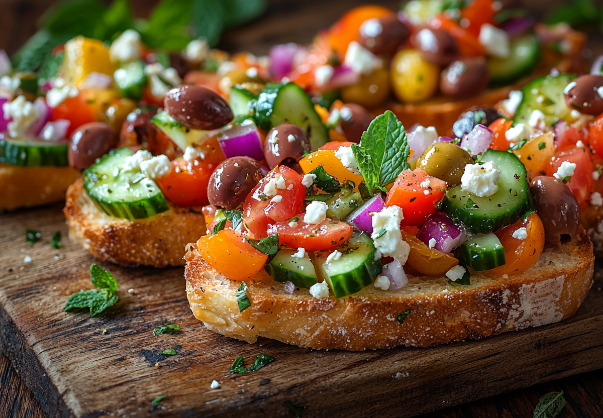 Греческий салат на чесночных гренках! Суперидея для привычного блюда! Этот вариант классического греческого салата подаётся на хрустящих чесночных гренках, что делает его идеальной закуской или лёгким обедом. Яркие овощи, пикантная фета и ароматные травы создают освежающий вкус, который понравится всем любителям средиземноморской кухни.