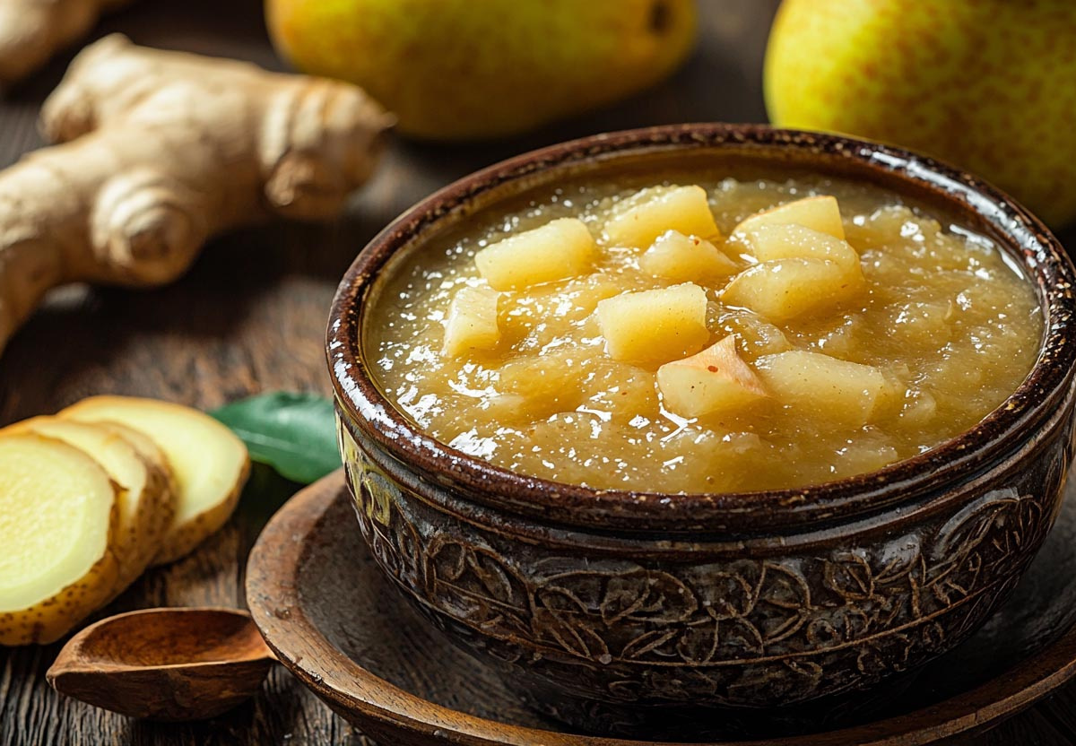 Возьмите килограмм упругих плодов груши-дички, очистите и нарежьте дольками. Сбрызните соком одного лимона. В сотейнике растопите 500 граммов тростникового сахара с 300 мл воды, добавьте тонко нарезанный корень имбиря (50 г) и пару стручков острого перца чили, разрезанных вдоль. Погрузите груши в бурлящий сироп и уваривайте на медленном пламени 25 минут. Внесите 200 граммов обжаренных грецких орехов, томите еще 15 минут до карамелизации. Горячий десерт разложите по стерильным керамическим горшочкам, закатайте и укутайте в одеяло до полного остывания.