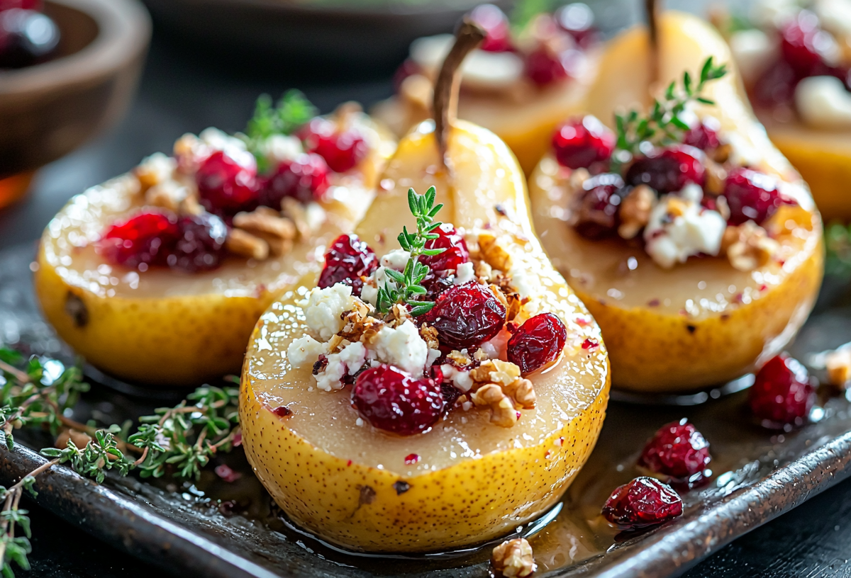 Тщательно помойте груши и разрежьте их пополам, удалив сердцевину. Нарежьте фету мелкими кубиками или раскрошите руками. Подготовьте сушеную клюкву и другие ягоды. Выложите груши на противень, сбрызните оливковым маслом и распределите его по поверхности. Заполните углубления в грушах сыром и ягодами. Разогрейте духовку до 180 градусов и запекайте груши 15–20 минут до мягкости и подрумянивания. Достаньте груши из духовки и равномерно полейте финиковым сиропом. Посыпьте блюдо листиками тимьяна, посолите и при желании приправьте щепоткой молотого перца. Подавайте груши горячими, украсив измельченными грецкими орехами.