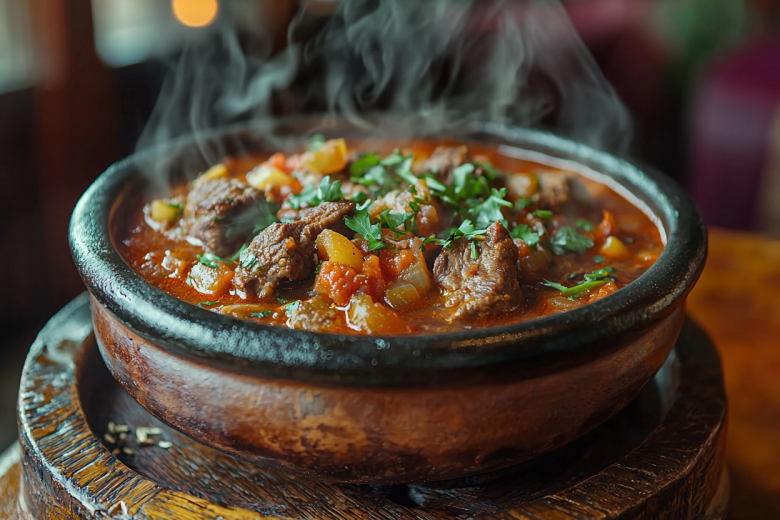 Для приготовления вам понадобится: 600 г говядины (мякоть), 3 крупные луковицы, 4 спелых помидора, 1 острый перец (по желанию), 4 зубчика чеснока, пучок кинзы, 1 ч. л. хмели-сунели, соль, черный перец и немного растительного масла. Мясо нарежьте крупными кусками, лук — полукольцами, помидоры — дольками. В казан или толстостенную кастрюлю выложите слоями: мясо, лук, помидоры, посыпьте специями и измельченным чесноком. Добавьте немного воды (около 100 мл), накройте крышкой и тушите на самом медленном огне 2–2,5 часа. За 10 минут до готовности добавьте рубленую кинзу. Подавайте с лавашом или отварным рисом.