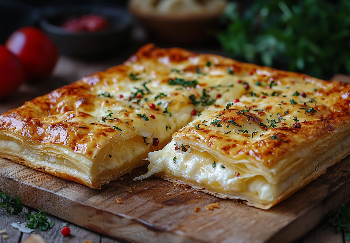 Вкус получается насыщенным и гармоничным: солоноватая, нежная брынза в сочетании с расплавленным сыром и сливочным маслом создает идеальную текстуру, а слоеное тесто, пропекаясь, становится воздушным и рассыпчатым.