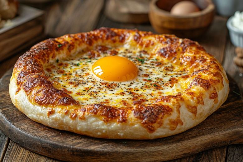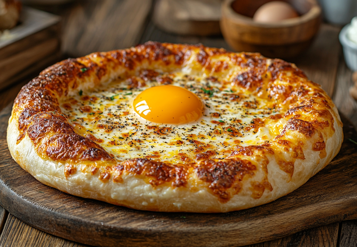 Рецепт: для теста замесите 500 г муки, 250 мл кефира, 100 г растопленного сливочного масла, 1 яйцо, 1 ч. л. соли и 1 ч. л. сахара, дайте постоять 30 минут. Для начинки смешайте 400 г смеси сыров (сулугуни и любой другой на выбор), 2 яйца и 50 г сливочного масла. Раскатайте тесто в толщиной 5 мм, сверху выложите начинку. Выпекайте при 200 °C 15 минут, затем достаньте, сделайте углубление в начинке, вбейте яйцо и верните в духовку еще на 2 минуты.