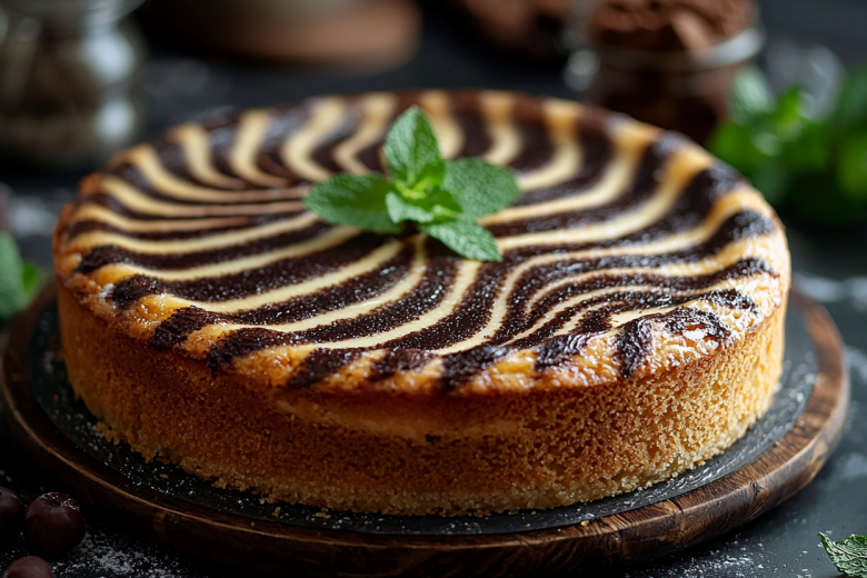 Для приготовления вам понадобится: 170 г муки, 170 г манной крупы, 400 мл кефира, 180 г сахара, 50 г размягченного сливочного масла, 1 яйцо, 8 г ванильного сахара, 1 ч. л. соды, щепотка соли и 3 ст. л. какао-порошка. Смешайте кефир, манку, сахар, ванильный сахар, соль и соду, оставьте на 15 минут. Добавьте растопленное остывшее масло, яйцо и муку, замесите однородное тесто. Разделите его на две части. В одну часть вмешайте какао-порошок. В смазанную маслом форму выкладывайте ложками, чередуя светлое и темное тесто, создавая произвольный рисунок. Духовку разогрейте до 180 °C. Выпекайте 35–40 минут до сухой зубочистки. Дайте полностью остыть в форме, чтобы десерт хорошо сохранил свою структуру и был легким для нарезки.