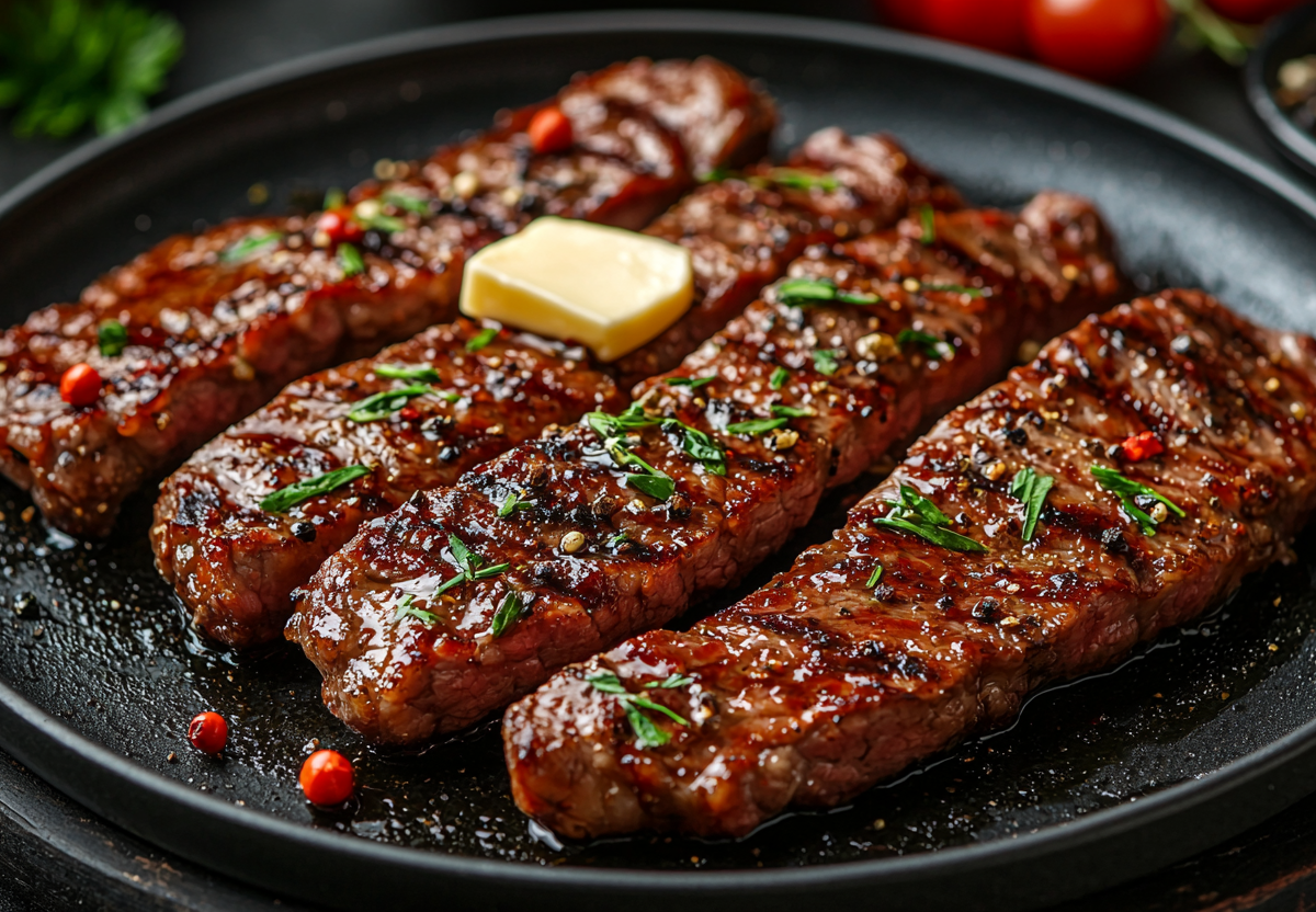 Вкус такого стейка — это взрыв сочности с карамельной корочкой, где соль подчеркивает естественную сладость мяса, а перец добавляет пикантную теплоту. Аромат дымка, который обычно дает гриль, заменяется глубоким обжариванием — масло и чугун создают эффект «угольного» шарма.
