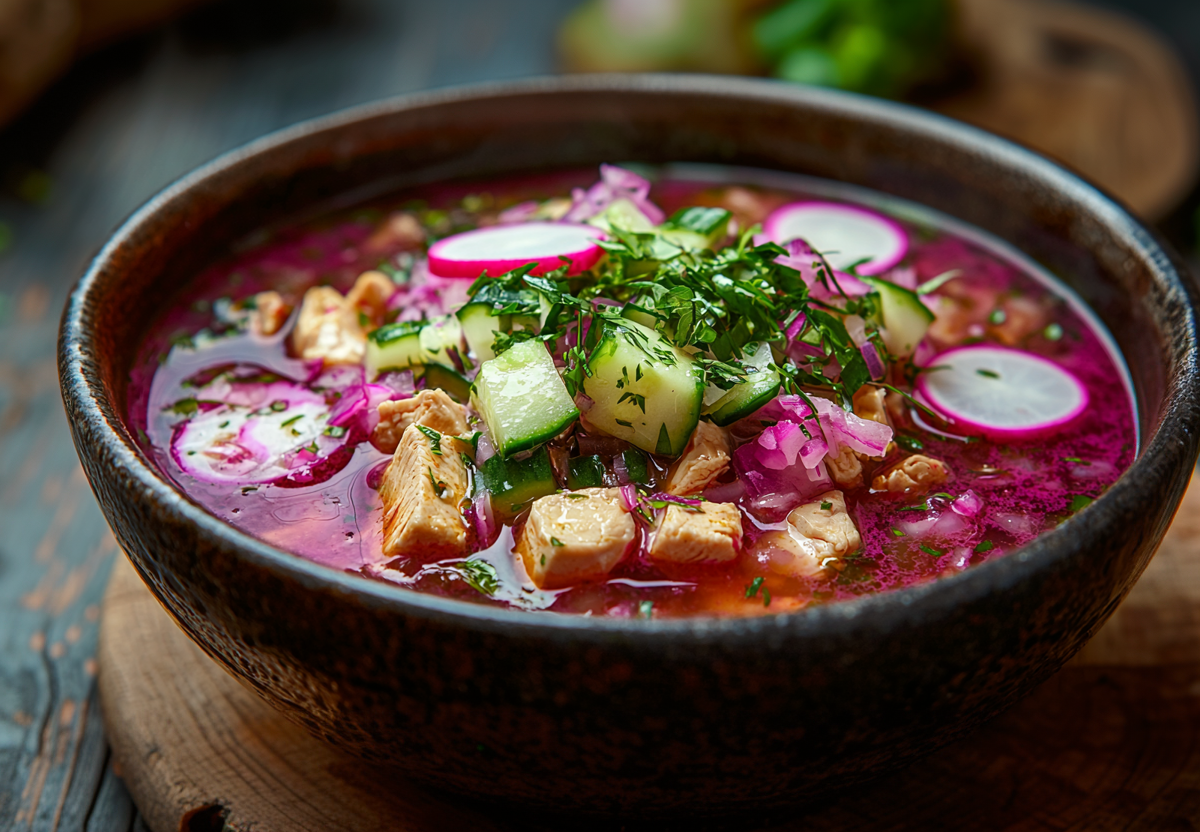 Представьте бархатисто-холодный свекольный отвар с хрустом огурца, редиса и яйца, нежностью отварной курицы, освежающей кислинкой кефира и укропа — это взрыв витаминов, который спасет от жары за 10 минут!