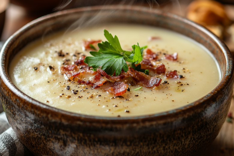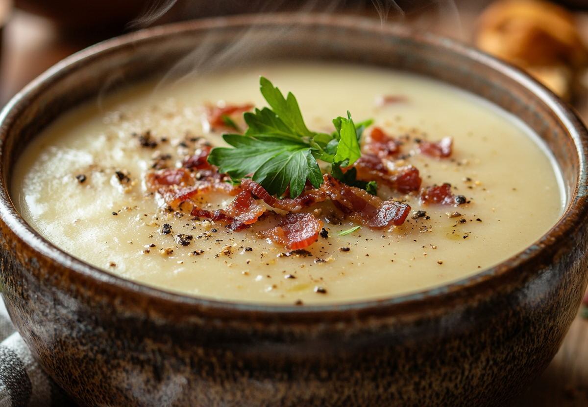 Приправьте солью, чёрным перцем и чайной ложкой копчёной паприки, слегка прогрейте, не доводя до кипения. Перед подачей верните в суп обжаренный бекон, аккуратно перемешайте и разлейте по тарелкам. Горячий, ароматный, с хрустящими кусочками — он покорит с первой ложки!