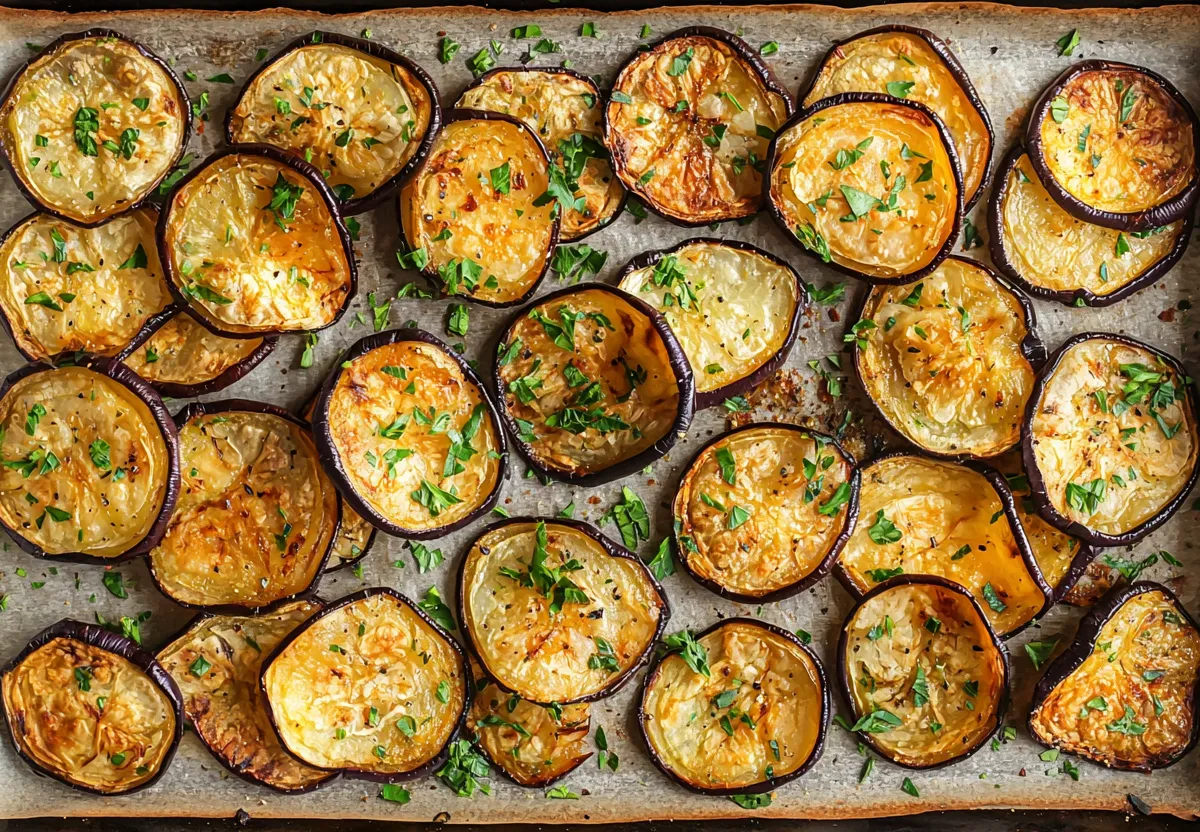 Смешайте уксус с маслом и специями в глубокой тарелке. Баклажан нарежьте тонкими пластинками и полностью окуните в маринад. Оставьте на ночь, чтобы ломтики хорошо пропитались. Затем выложите их на противень с пергаментом и слегка полейте остатками маринада. Запекайте 1 час при 150 градусах, пока ломтики не подсохнут и не станут хрустящими. Такие чипсы исчезают со стола моментально — попробуйте, и ваши домочадцы точно оценят.